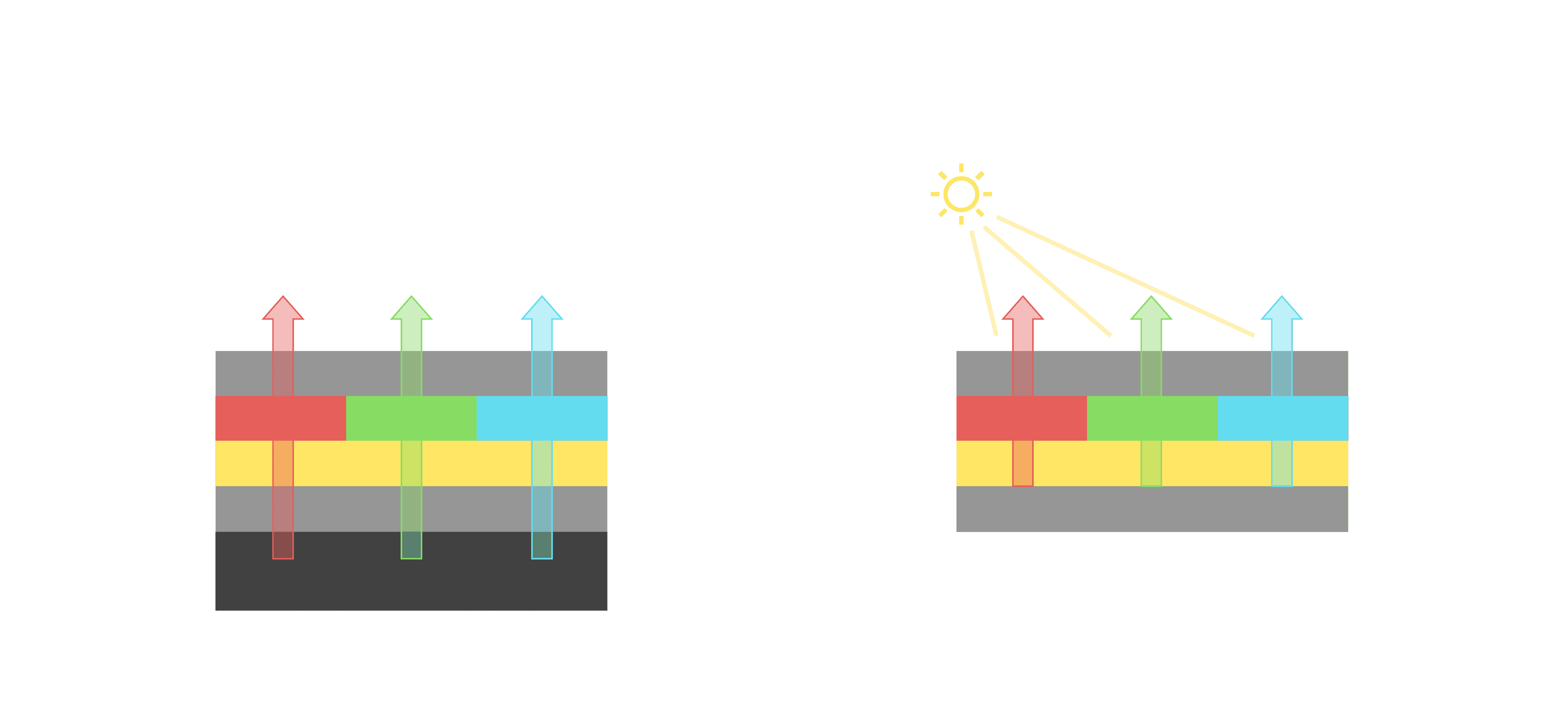 与传统需搭配背光单元的液晶显示相比,,,,反射式液晶技术不仅更省电、、、更轻薄,,,,且即便在艳阳下仍能清晰显示。。。。此外,,,少了背光单元,,,也大幅降低了 LED 蓝光伤害眼睛的疑虑。。